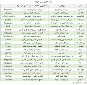 | نام | موقعیت | آبهایی را كه به یكدیگر متصل میسازد | |