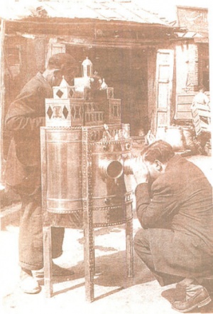 جعبهای مکعب به عرض ۶۰ و طول ۸۰ سانتیمتر تا یک متر، که داخل آن سه ذرهبین روی چهارپایهای به ارتفاع ۵۵ سانتیمتر نصب شده بود و چراغ کوچکی داشت که موقع نمایش عکسها روشن میشد. نوار عکسها را بهوسیلۀ دستهای از پشت ذرهبینها عبور میداد. حرکت سریع دستۀ شهرفرنگ موجب میشد که عکسها متحرک به نظر آیند. شهرفرنگی، دستگاه را به کول میگرفت و در محلههای پرجمعیت به بچهها و گاه بزرگترها نشان میداد. بچهها حرکت عکسها را از پشت شیشۀ بزرگ دستگاه شهرفرنگ تماشا میکردند.
