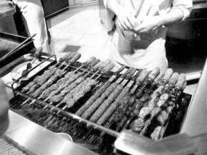 از مشاغل مهم و پُررونق، محل پختن و فروشِ چلو و کباب. چلوکباب مشهورترین غذای ایرانی است و خوردنِ آن، بهویژه در دکانهای چلوکبابی، همواره با نوعی تبختر و لقلقۀ لسان همراه بوده است. گوشتِ مصرفیِ چلوکبابیها از کشتارگاهها و قصّابیها تأمین میشود. به سیاقِ کبابخانههای سنتی قدیم، دکانِ برخی چلوکبابیها از محوطهای وسیع، که در آن تختهای چوبیِ مفروش یا میز و صندلی نهادهاند و سکویی که استاد کبابپَز بر منقلِ مشتعل انواعِ کباب را آماده میکند، تشکیل شده است. تا پیش از این، پخت و عرضۀ کباب فقط در موقعِ ناهار بود و چلوکباب غذایی برای شام به حساب نمیآمد و در دکّانهای چلوکبابی جز چلوکباب غذایی دیگر سِرو نمیشد. در چلوکبابیها عمدتاً دو نوع کباب برگ و کوبیده داده میشد. پیشتر، خوردنِ چلوکباب در چلوکبابیها قواعدی داشت که عملاً منسوخ شده است. چون مشتری وارد مغازه میشد، صندوقدار از جای خود برمیخاست و پس از خوشوبش با مشتری، شاگردی را صدا میکرد تا برای مشتری جایی تدارک ببیند. به محضِ نشستنِ مشتری بر جای خود، مجمعهای، که بر روی آن بشقاب و نان و نمک و فلفل و پیازِ خام و سماق و دوغ یا شربت بود، روی تخت نهاده میشد. شاگردی که چلوبیار خوانده میشد، چلو میآورد و شاگرد دیگر پشت سر او قاشقی کَره بر برنج مینهاد و سپس شاگرد موسوم به کباببِده با چندین سیخ کباب در دست بر سرِ تختِ مشتری حاضر میشد و سیخی کباب بر برنج مینهاد. از مشهورترین چلوکبابیهای تهران در روزگاران پیش، چلوکبابی شمشیری، واقع در سبزهمیدان، و در دوران معاصر چلوکبابی نایب بوده است.