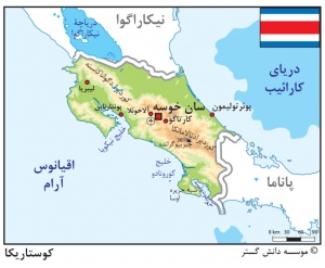 سیمای طبیعی. کوستاریکا سرزمینی ناهموار و کوهستانی است و ارتفاع آن بین ۹۰۰ تا ۱,۸۰۰ متر است. رشتهکوههای کوردیرا دِ تالامانکا[۲]، کوردیرا سانترال (کوردیرای مرکزی)[۳]، و کوردیرا گوانا کاسته[۴]، که سراسر این کشور را از شمال غربی تا جنوب شرقی دربرگرفتهاند، اسکلت ارتفاعی این سرزمین را تشکیل میدهند. بلندترین نقطۀ آن به نام کوه چیریپو گرانده[۵] با ارتفاع ۳,۸۱۹ متر، و نیز آتشفشان فعّال ایراسو[۶] با بلندی ۳,۴۳۲ متر در همین ارتفاعات قرار دارند. جلگۀ مرتفع مِسِتا سنترال[۷] که در میان کوههای بالا واقع است بیشتر آبادیها و جمعیت کوستاریکا را در خود جای داده است. کرانههای دریای کارائیب[۸] را ساحل باریکی تشکیل داده و خط ساحلی اقیانوس آرام را بریدگیها و خلیجهای چندی، مانند خلیجهای کوچک سالیناس[۹]، نیکویا[۱۰]، کورونادو[۱۱]، و گولفو دولسه[۱۲] و نیز شبهجزیرههای نیکویا و اوسا[۱۳] ـ پدید آوردهاند. رودخانههای متعددی در این کشور کوچک جریان دارند که مهمترین آنها رود سان خوان[۱۴] است که در شمال این کشور جاری است و بخشی از مرز آن با نیکاراگوآ را تشکیل میدهد. کشور کوستاریکا به هفت استان تقسیم میشود و شهرهای مهم آن عبارتاند از سان خوزه، کارتاگو[۱۵]، آلاخوئلا[۱۶]، گواناکاستِه[۱۷]، اِرِدیا[۱۸]، پوئِرتو لیمون[۱۹]، و پونتارِناس[۲۰]. اقلیم کوستاریکا بسیار گرم و پرباران است. نواحی ساحلی اقیانوس آرام استثنائاً یک فصل خشک دارد که از آذر تا فروردین به درازا میکشد و برعکس، سواحل دریای کارائیب در سراسر سال بارانی است. میانگین دمای شهر سان خوزه در دیماه ۱۹ درجۀ سانتیگراد و در تیرماه ۲۰.۶ درجۀ سانتیگراد است و میانگین بارندگی سالانۀ آن به ۱,۷۹۳ میلیمتر میرسد. نواحی ساحلی پوشش جنگلی انبوهی دارد که ۲۵ درصد از مساحت کشور را شامل میشود و انواع پرنده و ترکیبی از پستانداران امریکای شمالی و جنوبی، حیات وحش آن را تشکیل میدهند.